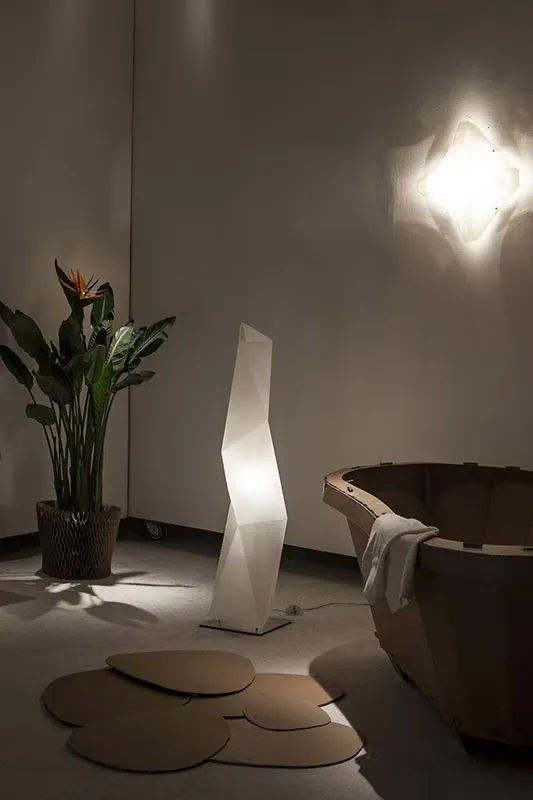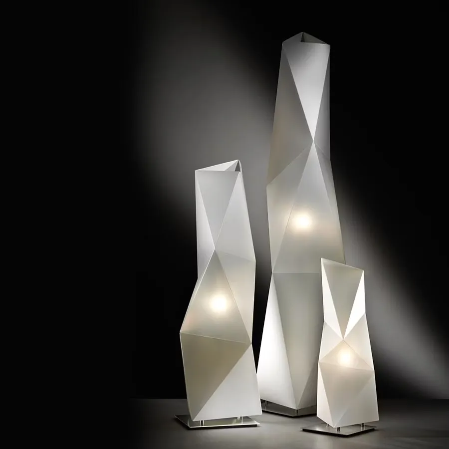 Diamond Floor Large White, design di Paolucci – Statera, è una lampada da tavolo scultorea e moderna ispirata alle opere di Brancusi. Il design geometrico valorizza la luce creando giochi di ombre ed effetti luminosi unici. Disponibile in tre dimensioni, è perfetta per comodini, living o installazioni domestiche scenografiche.