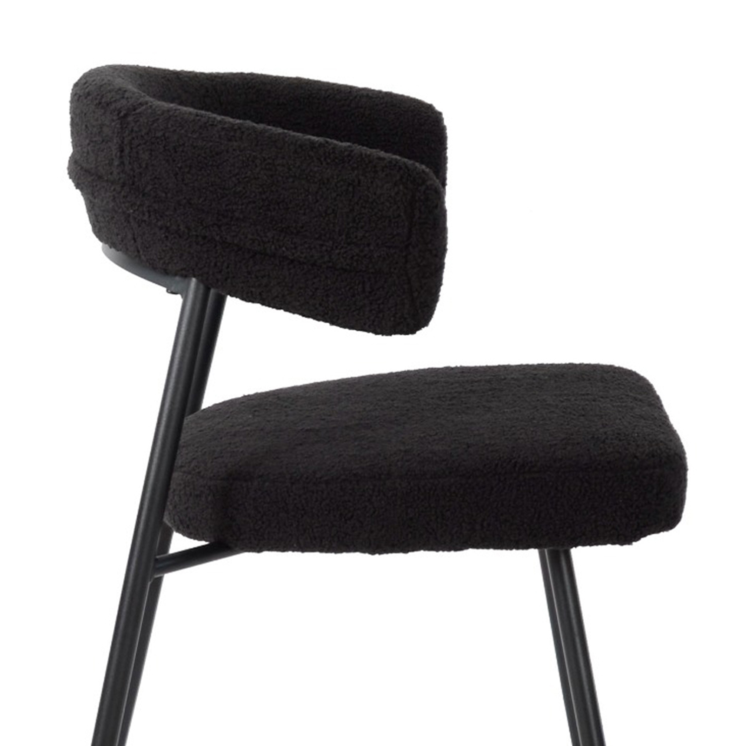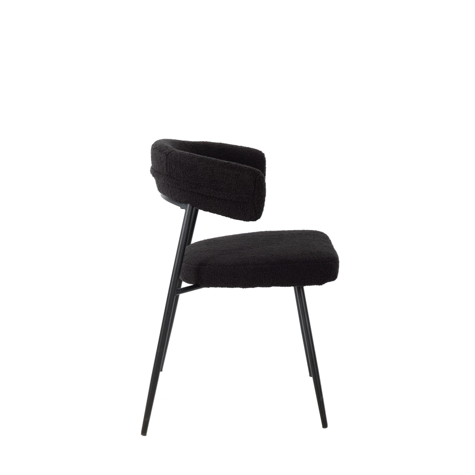 Le gambe sottili in metallo verniciato nero slanciano la struttura e creano un elegante effetto monocromatico, perfetto per interni moderni ed essenziali. Posizionata accanto al divano, in camera da letto o in un angolo lettura, questa poltrona aggiunge un tocco sofisticato e deciso, mantenendo un ingombro visivo leggero.