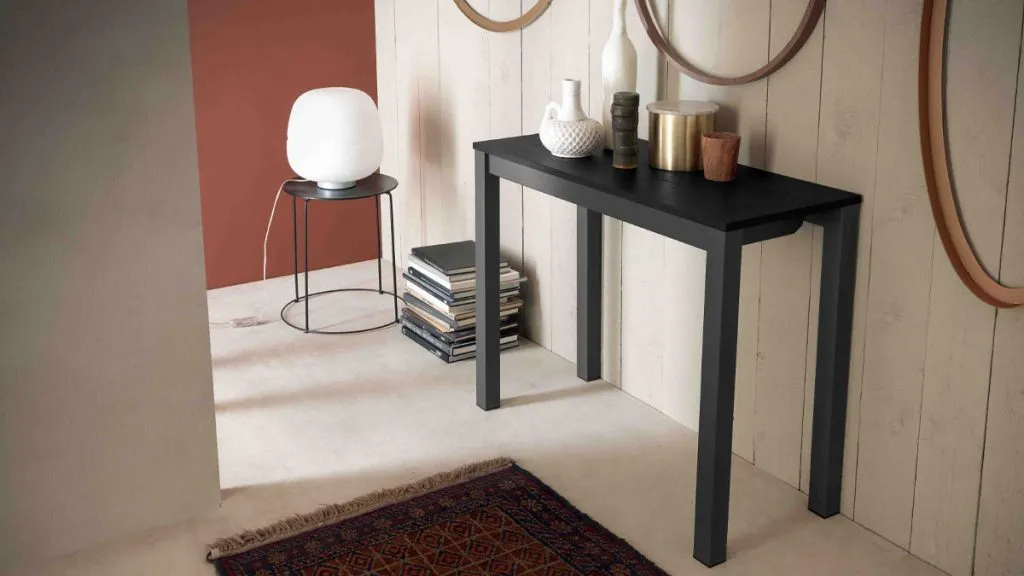 Consolle estensibile, struttura in metallo, meccanismo telescopico in alluminio, piano in nobilitato, effetto