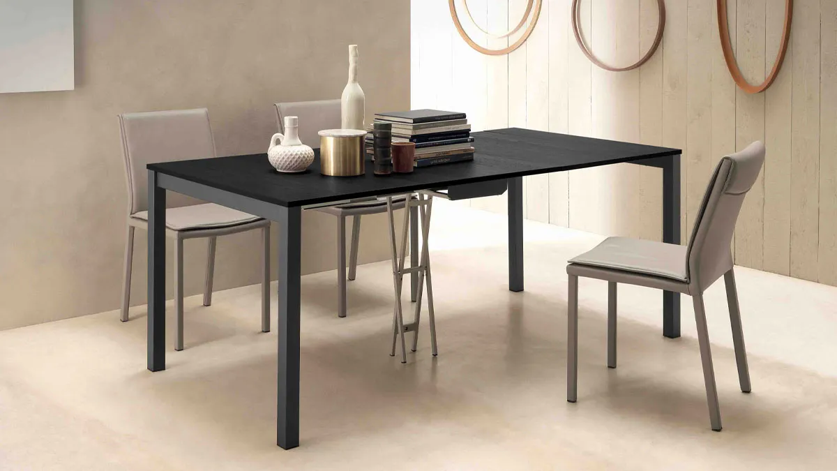 Consolle estensibile Quad AC001/190 – Tavolo trasformabile con base in metallo M11 e piano N42. Dotata di meccanismo telescopico in alluminio e 3 allunghe, garantisce praticità e versatilità. Le gambe centrali di supporto o la borsa porta allunghe opzionale Extenso assicurano funzionalità e ordine. Il piano in nobilitato, effetto malta o ceramica mantiene continuità estetica con le prolunge, ideale per arredare living e sale da pranzo moderne.