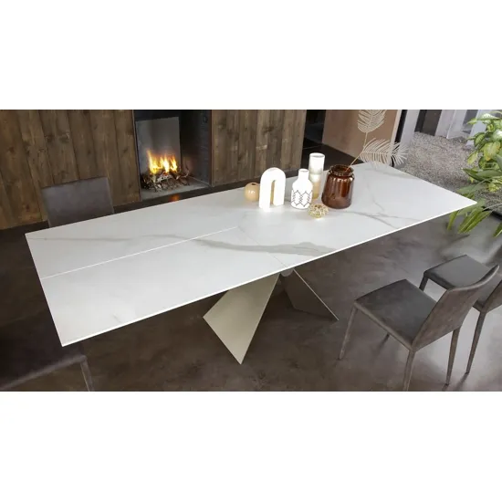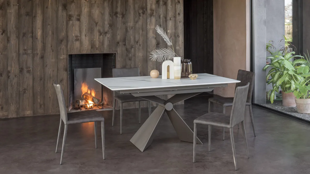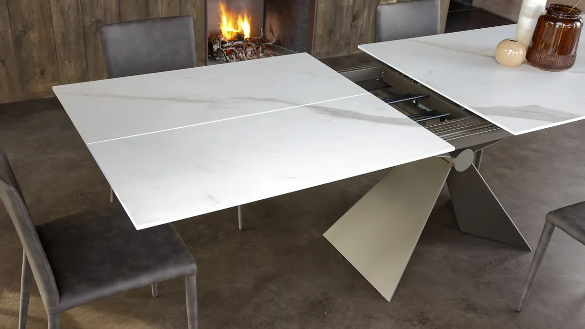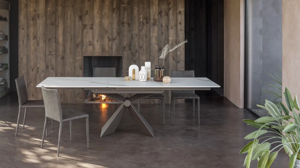 Tavolo Sintesi AT127C160 – Tavolo da pranzo allungabile con struttura in metallo finitura M19 e piano in ceramica K17. Dotato di meccanismo telescopico con apertura sincronizzata e prolunga interna a libro, garantisce continuità di vena per un effetto elegante e naturale. Unisce praticità e design moderno, ideale per la sala da pranzo o il living.